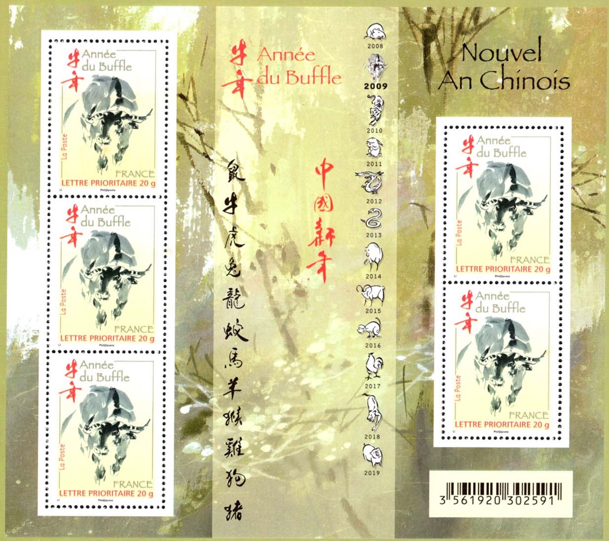 In 2009, Christmas Island Post issued a two-stamp souvenir sheet designed by Poon Tak Nai, to celebrate the loyalty of ox. In 1997, Canada Post issued a miniature sheet with two stamps for the Year of the Ox, the golden background sets off the character "blessing" in the couplet, and the ox is outlined with just a few strokes. Designed by Liu Xiangping, a Chinese painter living in Canada, this fan-shaped miniature sheet has a Chinese charm, simple and elegant, with a silhouette of lovely ox. In 2009, La Poste issued the Year of the Ox stamp sheet, designed by French-Chinese artist Li Zhongyao, containing five stamps with an ink painting bamboo forest as the background, where a vibrant Chinese ox in ink painting walks along a pale yellow road in a low-key golden frame. In the upper left corner of the stamp, the Chinese characters “Year of the Ox” are printed in red, while French words are in gold. All stamps have no face value and are limited for domestic mail in France up to 20 grams. The designer chose ink painting precisely because this is an artistic form with Chinese characteristics and symbolizes people's hopes for a prosperous Year of the Ox.