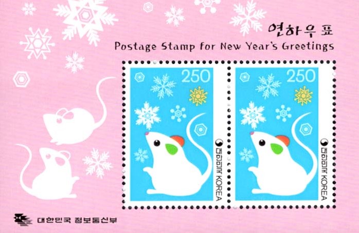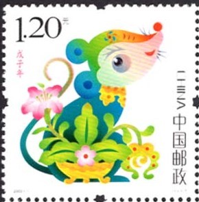 Em 1996, os Correios da China emitiram selo especial “Ano de Bing-Zi”, desenhados por Lü Shengzhong. Dos dois selos, o que tem um fundo cinzento apresenta um engraçado ratinho com longo nariz e barba, trajando um vestido florido e segurando uma lâmpada. O segundo selo é de um sol vermelho contra o caracter chinês “Rato” em Escrita Clerical Chinese, com seis ratinhos cinzentos escondidos na névoa de cores circundante. Invulgarmente, na emissão de selos especiais “Ano de Wu-Zi” de 2008, desenhada pelo casal Yu Ping e Ren Ping, há apenas um pequeno rato de aspecto infantil com um casaco verde e um colar de flores, transportando alegremente um cesto cheio de flores.